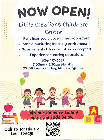 Little Creations Childcare Center Inc. is a licensed group childcare located in Maple Ridge, British Columbia. Little Creations Childcare Center provides care for infants and toddlers ages 0 - 36 months and 3 years to school age, offering children a nurturing environment that fosters their safety, emotional, social, cognitive, and physical development.